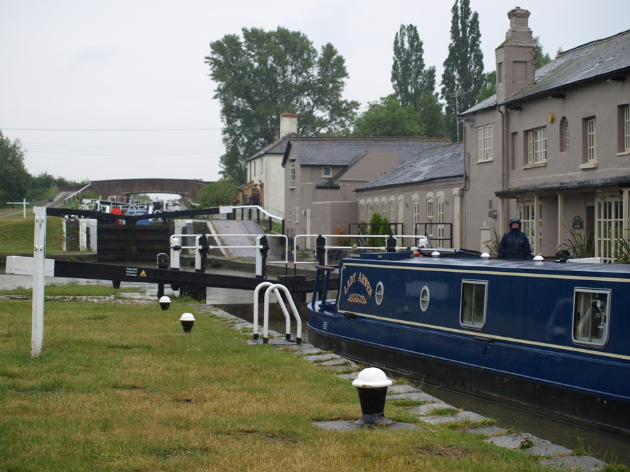 Friday 5th June - Needless to say when we got up on Friday morning it was raining! According to the weather forecast it was due to have passed over by 9.00am and then remain clear. Well it didn't! So we stayed put, well for the morning at least. Eventually the rain did ease off, around lunchtime and we finally set off. We had quite a few locks to negotiate on the way but as it wasn't raining and they were reasonably well spaced out it wasn't too bad. At one point during the afternoon we saw a very big, dark cloud which appeared to be heading our way, from behind. We could see in the far distance that it was raining but we managed to stay ahead of it for quite some time until finally, late afternoon, it caught up with us!