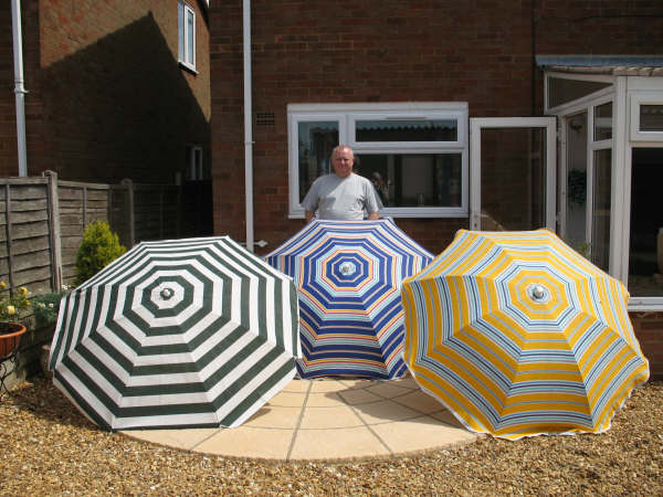 Oooh I almost forgot to tell you something! You will recall that I have been on a mission to find a plastic, water-filled, parasol base to no avail! Well I got an email from Shirley and Barry last week telling me not to buy a parasol because they had four and we could have one of them. Also they just happened to know that Ikea are currently selling plastic water-filled bases for £4.99 and would we like them to get one for us - absolutely! We then received this photograph asking us to choose a parasol: