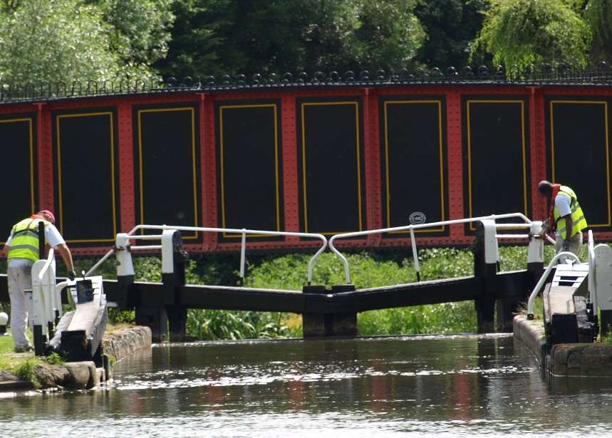 We arrived at the next lock and I jumped off the boat with the rope to pull her into the bank. The easiest way to do this is to quickly wrap the rope around a bollard and the forward movement of the boat and the tension on the rope gently ease the boat into the bank. I did this but noticed the rope turning white as it slid around the bollard � wet paint! Hmmmm? Clive took the rope from me and I went up to the lock to set it only to find two men painting the lock gates! Fortunately they had also been supplied with a windlass so I opened the paddle on my side and the guy over the other side of the lock opened the paddle on his side. Both men opened the gates for me and shut them behind the boat. This particular lock also had anti-vandal locks on the front paddles but they didn�t have a key � I did! Finally we got through the other side, luckily paint free!