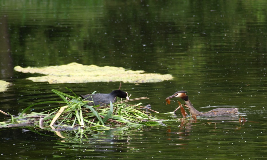 bits of blanket weed back to the nest for the Coot to put in place, really weird!