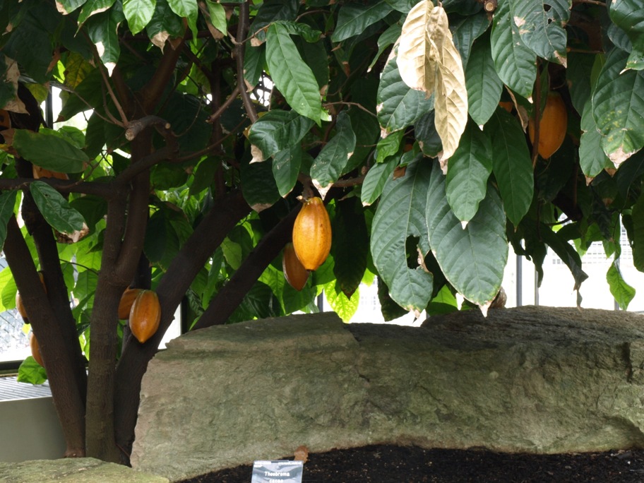 After our picnic we went into the Princess of Wales Conservatory. This is an amazing place, it is divided very cleverly into ten different climatic zones such as the arid zone which is home to all the different varieties of cacti and the tropical rainforest zone which is all hot and steamy and full of really exotic stuff. One plant I was very interested to see was the Cacao.