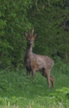 We have mentioned before that we have not seen much in the way of wild mammals, apart from the odd rabbit and a fox here and there. We have seen a few dead badgers in the canal but no live ones and not a single water vole since the day we set off, which is very disappointing. So you can imagine our delight when we caught the welcome sight of a mature Roe Deer buck just standing on the towpath a couple of hundred yards in front � just managed to get a couple of photos before he saw us and quickly disappeared into the shrubbery.