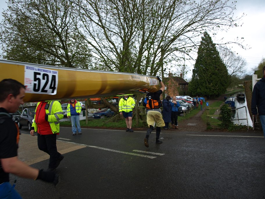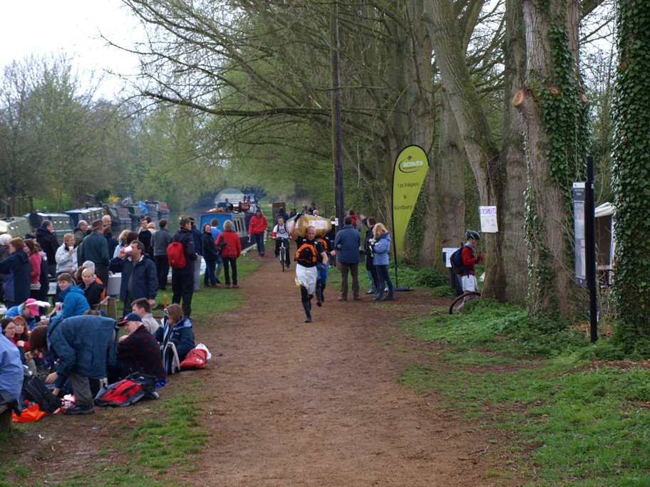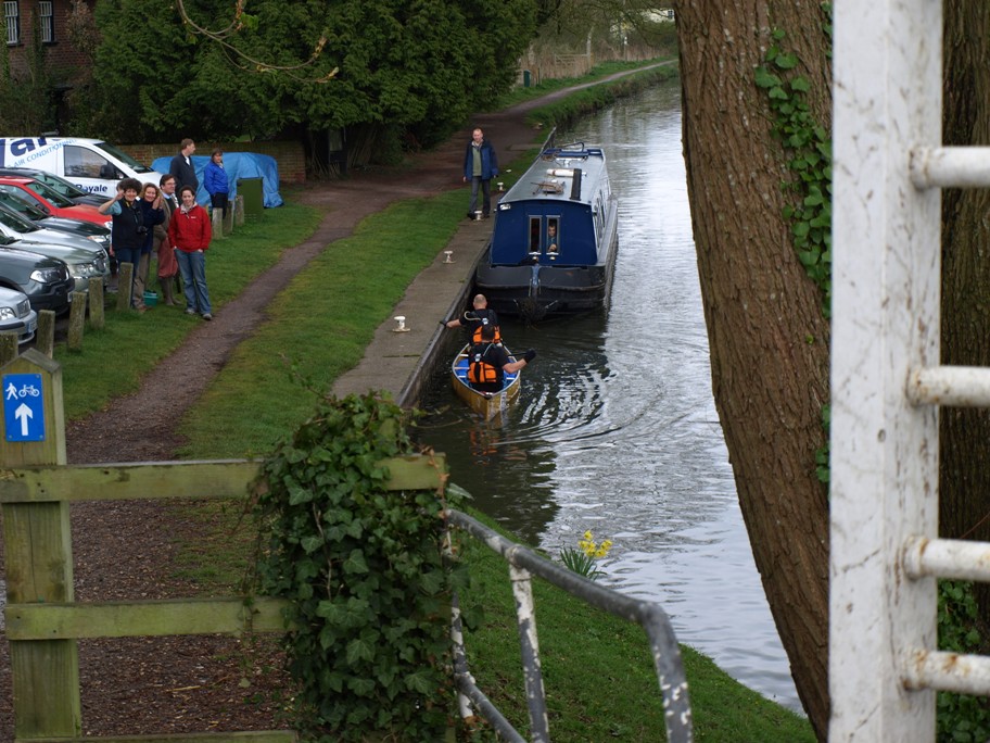 I went back to the boat and fetched Clive, firstly because I thought he would be interested in watching some of the competitors coming through and also because I thought it would be a good idea to have one of the Scout�s bacon rolls for breakfast! We hadn�t been there long, had just finished our rolls in fact, when we saw the first canoe coming towards us. Where we were all standing was right at the side of the lock � the canoeists don�t go through the locks, they pull into the bank, climb out and lift the canoe out of the water then carry it along the towpath, beyond the lock, in this instance that also entailed crossing the road, then down the other side, put the canoe back ino the water, climb in, then set off again! It's called portage!