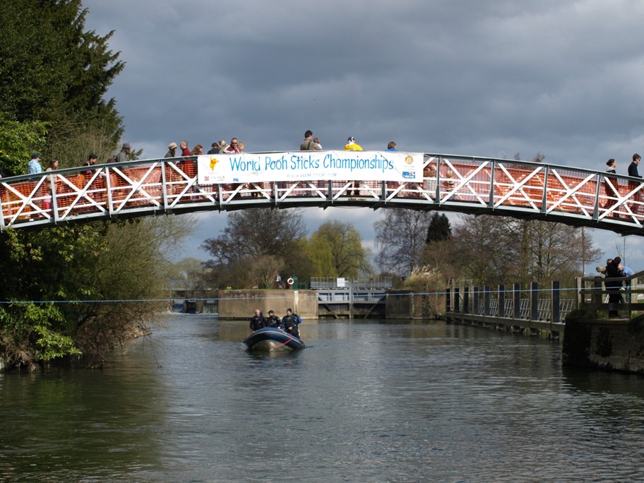 Well you could be forgiven for not guessing what they are up to, we were amazed when the lock-keeper told us what to expect - however as we passed under the bridge and looked back, all was revealed - it was the World Pooh-Sticks Competition!!! Can you believe it!