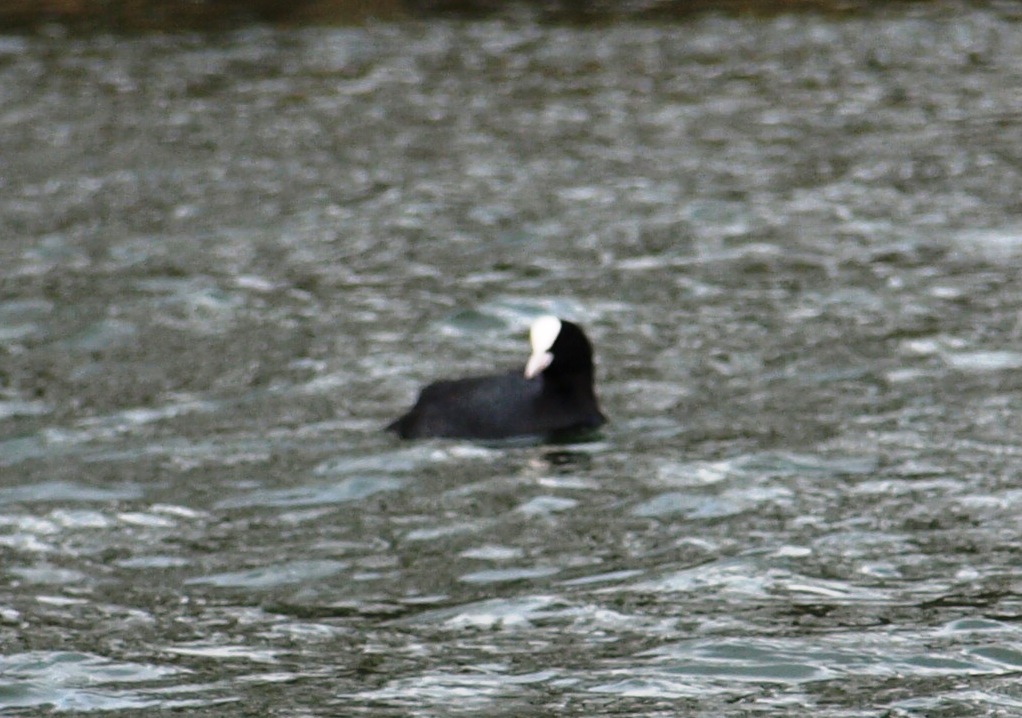 Coots, which look very similar to the Moorhen but which are larger and have a white blaze on their heads as opposed to the Moorhen�s red one, also these birds dive for food and we haven't noticed the Moorhens doing this.