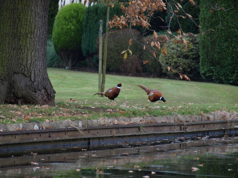 We arrived at the Baswich Viaduct where one of the stoppages had been, it opened this morning so we were able to continue straight on. It was very chilly, but quite pleasant cruising along looking at the countryside and the wildlife. We saw pheasants, buzzards, lots of rooks and a couple of rabbits � we really haven�t seen many rabbits on this trip at all, which is surprising. Anyway by the time it got to 3.00pm we had both had enough and were getting quite chilled so we decided to look for a decent mooring. We came over an aquaduct crossing a river and round a bend and found a brilliant mooring opposite a really stunning house with beautiful gardens right down to the canal. Once we were moored up and inside we were able to watch the wildlife in the garden. We saw a woodpecker and a jay, neither of whom would stay still long enough to get a photograph of, but there were more pheasants and they posed for me!