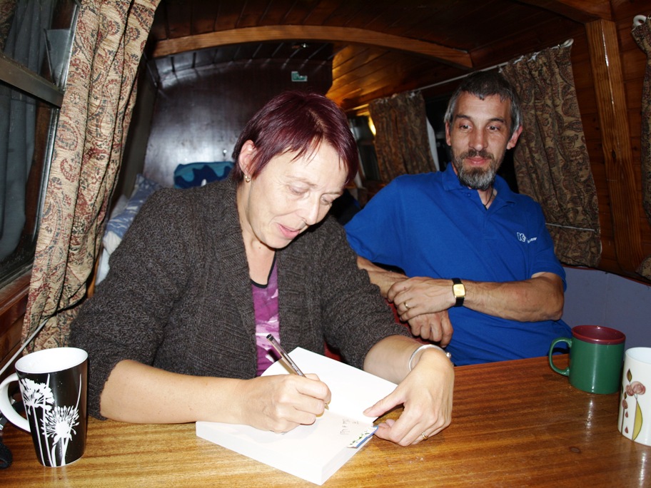 Once Geoff had drilled the holes I asked him if Marie would mind signing our book. He said he was sure she would be happy to. So we all traipsed along to Minerva. I was getting quite excited as having read 35 pages of the book I felt as if I knew all the family already! We were met at the boat by Mortimer, the family dog! He is a very exuberant and excitable one year old Staffy who is extremely friendly and incredibly strong! Poor Mortimer was banished to the garden once we were on board – bless! We met two of the characters from the book straight away, Sam and Charlie, who were watching TV in the saloon, then Geoff introduced us to Marie.