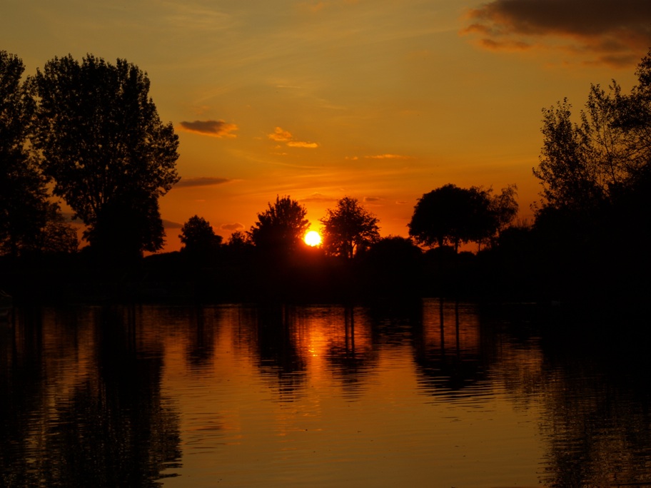 Once back on board we quickly cast off and got underway again. We didn’t want to stay in Peterborough overnight, especially as there was a huge funfair right next to the moorings and we figured it would be extremely noisy later and would possibly attract a few undesirables as well! We had set our hearts on mooring at Overton Lake again as it is so peaceful and pretty. There was one lock to negotiate on the way down but it didn’t take very long to get through and within an hour we saw the turn off to the lake. Just as we were coming out of the channel into the lake itself the sun was setting and it was a beautiful sunset, especially with the reflection off the water. I’m afraid I just had to take yet another sunset photograph! Well you have to admit, it’s gorgeous!