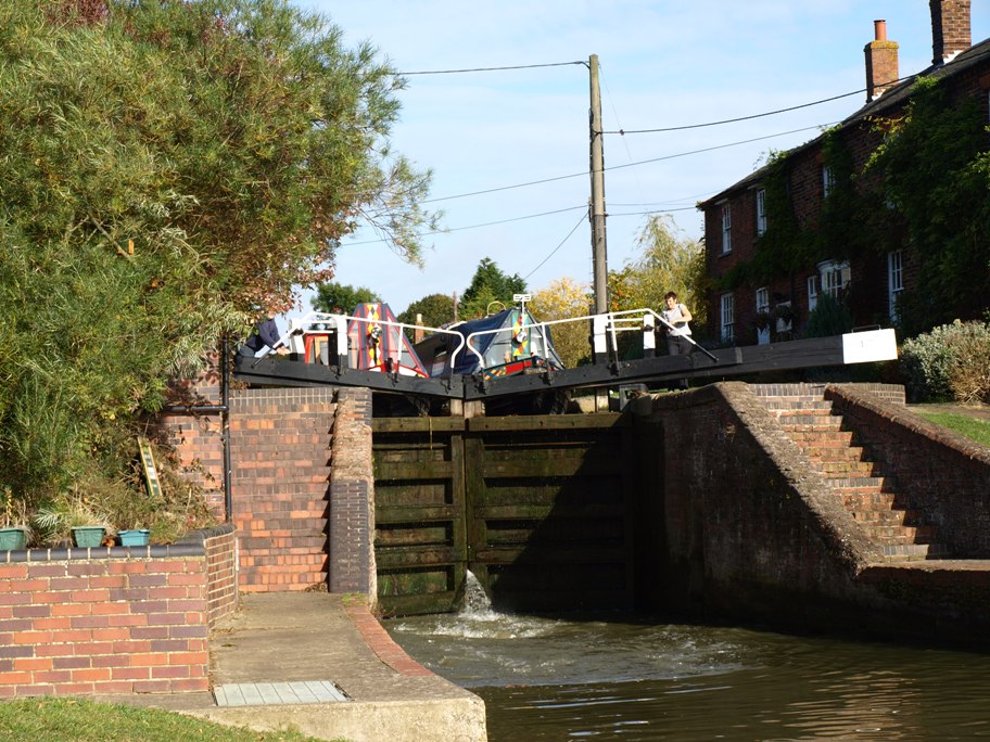 We had a bit of a cruise to the first lock, number 16 (we came through 17 last night) which was. as we had expected, set in our favour. All the locks on this flight are single locks with two gates at the bottom and one at the top. All I had to do was open one of the gates at the bottom and Clive would gently push the other gate open with the bows. I would then close one gate, trot up to the other end, cross the lock gate, sprint down the other side of the lock and shut the other gate, then trot back to the other end and open the paddles. The first three or four locks were a good distance apart so I got back on board after each one to ride to the next one. However, once we reached the bottom of the main flight, lock number 13, there was no more riding for me, it was Shank’s mare all the way to the top! But I must have walked double the distance because as each lock was filling I would walk up to the next lock and ensure that it was set for us – some of these old locks are quite leaky and can refill in a very short time, so I did have to open the paddles on some of them before I could open the gates - then I had to walk back to the previous lock to close the gate after Clive had brought the boat out. Clive did help as much as he could by dropping the paddles and opening the gate at each lock.