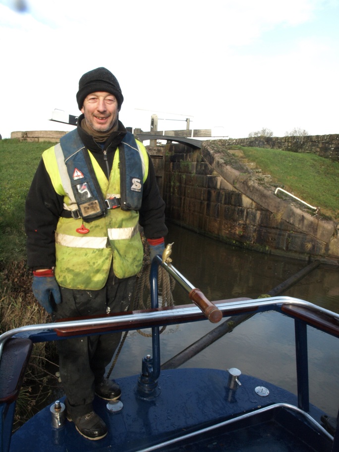 This pole should actually have been fastened to two posts, which we could see sticking out of the water, in order to form a barrier across a weir. One end of it had been chained to a hand rail at the side of the lock by someone called Heath Robinson I think, leaving the other end floating free. The only way to stop it drifting back across the lock gates was to somehow get it behind the posts. Using the boat we got it pinned up against the posts then Scott and one of his colleagues traversed the gunwales to the centre of the boat whilst Clive held the boat steady, then came the task of trying to lift the pole over the posts – no mean feat! This pole as I said is like a telegraph pole, about ten inches across the base, solid wood and waterlogged – it must have weighed a ton! Finally Scott climbed onto the roof of the boat, put the rope around his back and heaved – the boat promptly tilted alarmingly to port (the left side)! Clive and I quickly crossed to the starboard side of the stern and leaned to try and keep the boat balanced. Finally using brute strength Scott managed to lift it out of the water and got it on top of the post and after much jiggling and more lifting his mate managed to slip it over the post to the other side – hooray!