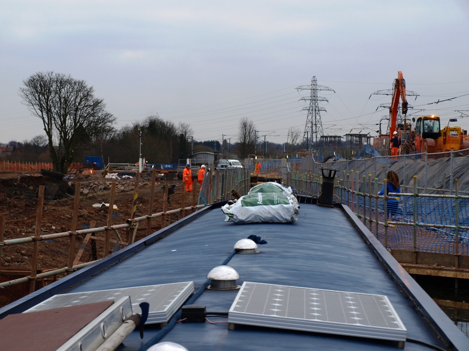 We continued on our cruise and I popped inside to make us a cup of coffee. I had just got back on deck, juggling two cups of coffee and a box of biscuits, when Clive said "what on Earth is that up ahead!" - I turned to look and got quite a shock - the canal appeared to stop! However, on closer inspection we realised that there was a very narrow channel wending its way through this huge construction site! Phew that's a relief!