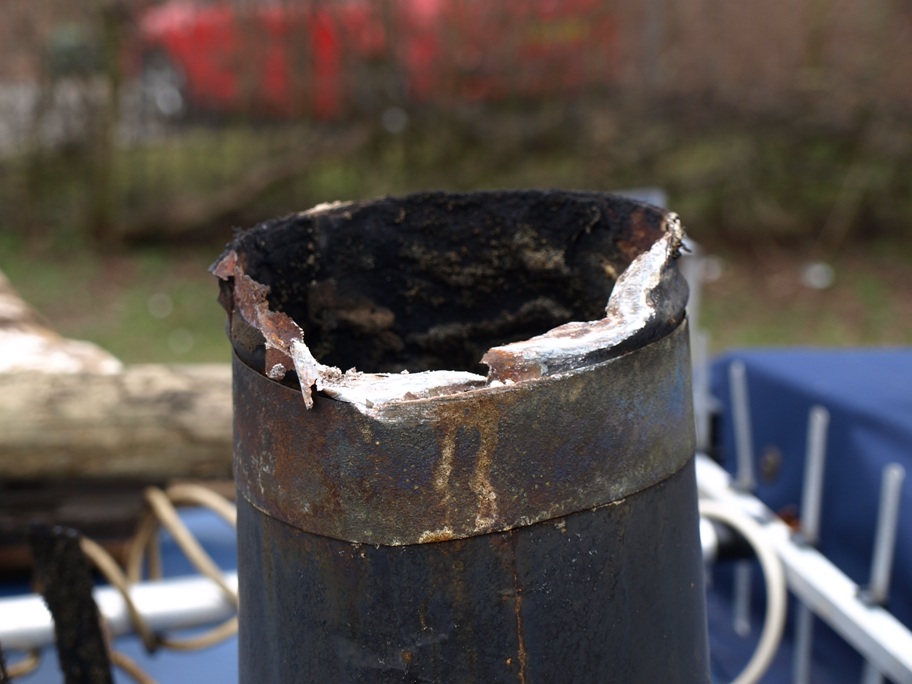 I was walking along the towpath following behind the boat when I heard a horrible bumping, grinding sound! I asked Clive what he had hit - he said it was the chimney scraping along the tunnel! Oh dear! Sure enough when the boat was in the next lock we went to inspect the damage and it looks as if we might need a new chimney!!! Not only had it ground the top off the side of the chimney it had also broken one of the brackets that holds the TV aeriel!