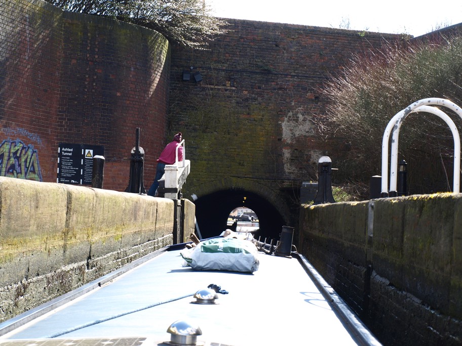 We started down the next flight and this time I let the expert do it - perhaps as well because it was quite windy and I am not experienced enough to cope with strong winds as well. Even Clive struggled at one point as the wind was taking the boat right across the canal! A couple of locks further on and the canal went through a tunnel, a very narrow, low tunnel.