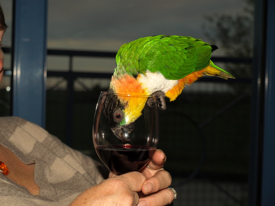 It was great to see Laura and Alison again but I was absolutely delighted to reaquaint myself with Jaffa - he really is a wonderful bird, apart from being very pretty, having the most incredible coloured feathers, he is just so fascinating and funny. He seemed to be as pleased to see me as I him and insisted on sitting on me whilst he investigated all my jewellery, especially my earrings! In the end I had to take them off, he wouldn't leave them alone. However it wasn't only my jewellery he was interested in, it was also my wine! He is evidently a bit of a tippler and is quite happy to take a wee dram of whisky or a nice drop of wine and he definitely had his eye on mine! Eventually it was just too much for him and he climbed onto my glass, dipped his beak in and took a quick slurp! He did this several times, even though Alison removed him he kept coming back, he was most definitely a typsy Caique by the end of the evening!
