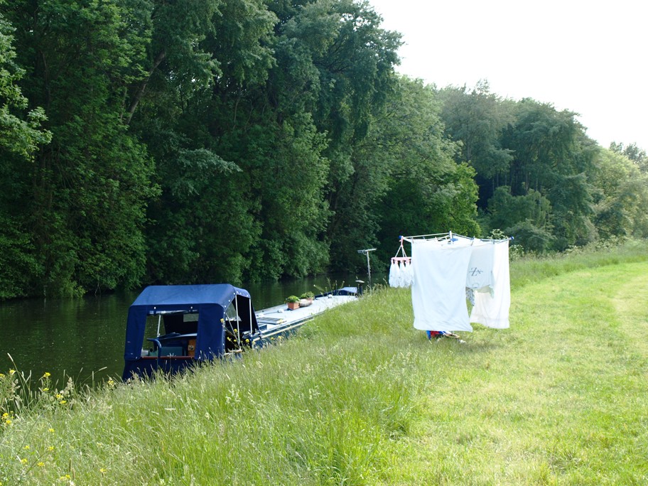 The following morning I traipsed up to the launderette with my washing and sat reading my book until it was finished then carted it all back to the boat. I had decided, as it was such a lovely warm, sunny day, that I would only wash the clothes and not use the dryers, so we needed a nice place to moor up out in the country somewhere so that I could hang up my smalls to dry without blushing! We cruised for about an hour and then arrived at a really lovely spot near the village of Dorchester where the little River Thame joins the big River Thames. The only problem was that the banks were quite high. However we managed to find one spot where there was a chunk missing in the bank and it was a perfect spot for getting on and off the boat using our plank! We soon got tied up and up went the whirlygig and in no time at all my washing was blowing in the wind - smashing!