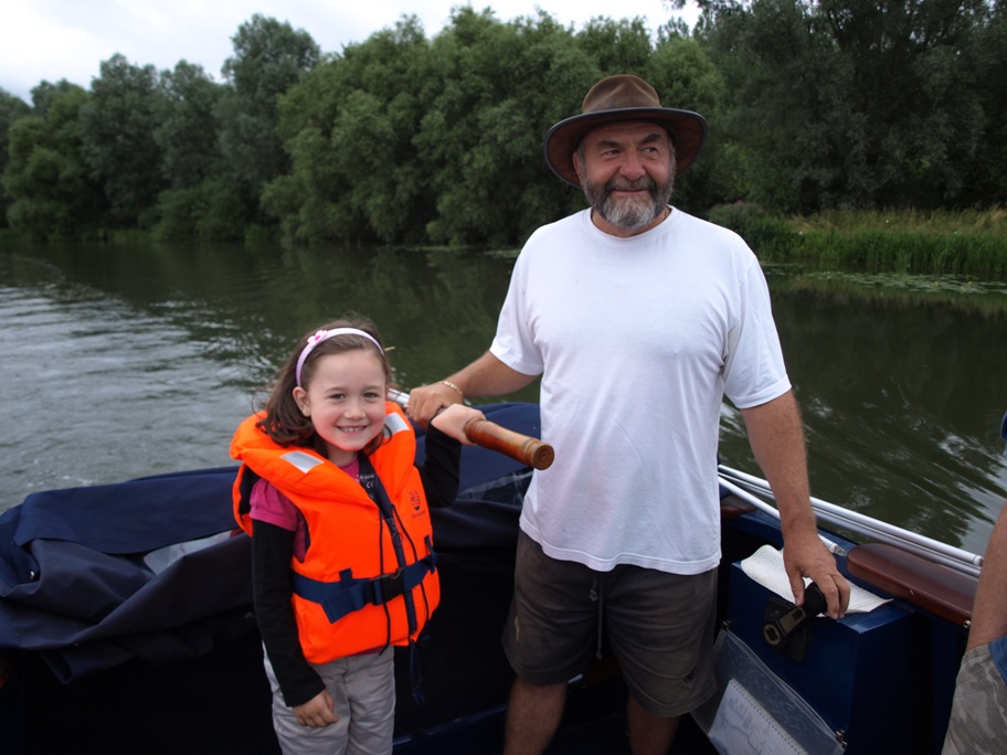 On the Sunday afternoon, July 10th, Vicki brought Gareth and Indy over to the boat to stay with us for a few days as we cruised towards Cambridge. We had a great time with them on board but I think Indy preferred being inside playing on the computer than being up on deck cruising. She did help Granddad to steer though!
