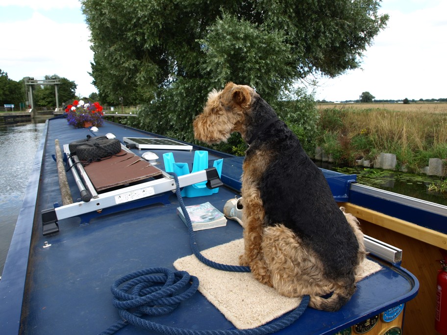 We finally set off after lunch and Lindsey and Pat thoroughly enjoyed the trip, this being their second stay on a narrowboat in only a few days. Another friend of Lindsey's, Christine Thorpe, who I used to know at Junior School too, also has a narrowboat and Lindsey and Pat had been to stay with her for a couple of days before coming down to us. They had been cruising on the Caldon Canal in Staffordshire. Thankfully we had much better weather for our cruise up the Cam. One thing that delighted me was having Jesh on board. I have been nagging Clive for the last couple of years to get either a ship's dog or a ship's cat but he won't! He thinks it would be too tying - I would so love a dog - I shall keep on at him, I'm sure he'll relent one day! Anyway in the meantime I got my wish temporarily - Jesh took to boating like a duck to water!