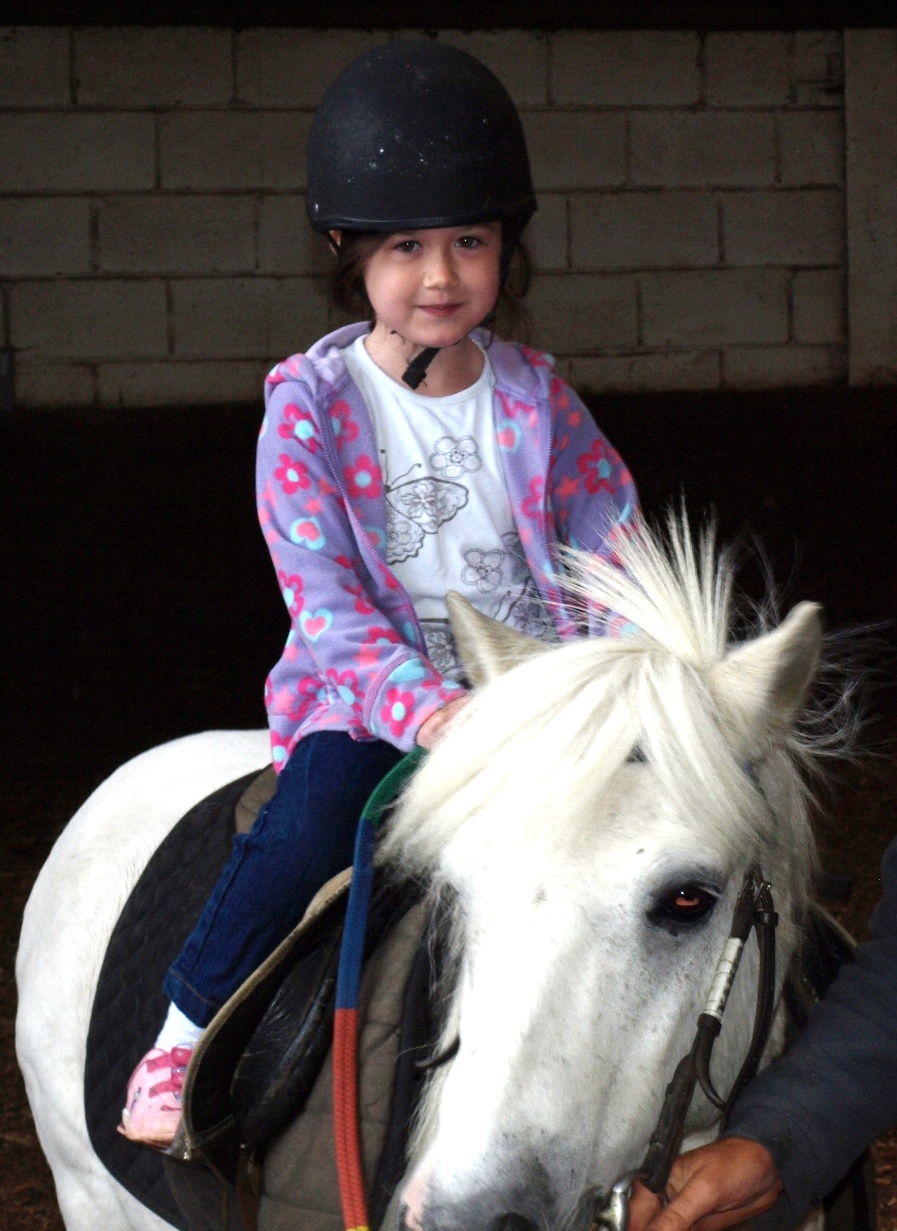We duly arrived in Cottenham and then proceeded to walk through the village to our destination. We stopped at a crossroads to look at a large map on the side of the road. Just as we found the "You Are Here" arrow we heard a horn honking behind us - Gareth and Indy! Gareth told us which way to go (he had his satnav on!) and we followed in his wake. A few minutes later he arrived back, without Indy and said he would give me a lift first then come back for dad! Finally we were all where we should be and there was Indy, looking very excited and happy sitting on the back of the cutest little white pony you ever saw! Her very first riding lesson.