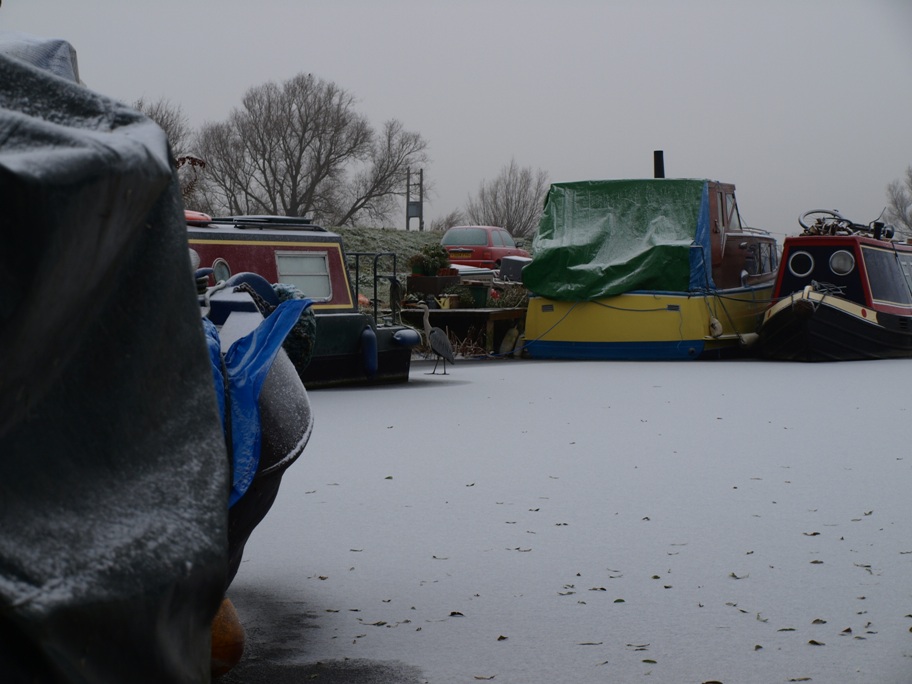 Vicki duly arrived in the hire car to pick us up and we soon had all our cases and baggage stowed in the boot. It was time to say goodbye to Lady Arwen! Oh dear, I hope she's going to be OK without us! I gave her a little pat and blew her a kiss - I know, I'm a big softy but she is after all our home! We left her in the frozen marina with only an old heron skating about on the ice to keep her company! Can you spot him?