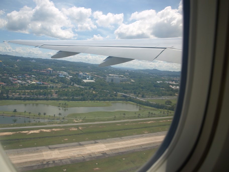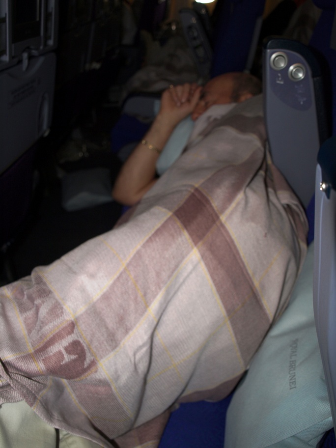 Off we went again and flew for several more hours then touched down for the second time, this time in Bandar Seri Begawan, Brunei. Once again we were told to disembark, taking all our belongings with us. We didn't have to walk as far this time and also we were changing planes. Our new seats were a couple of rows in front of the ones we were in on the first plane but this time there were only the two of us and the third seat in the row was vacant so we had a bit more space to spread out. It wasn't long before we were taking off again on the last leg of our journey.