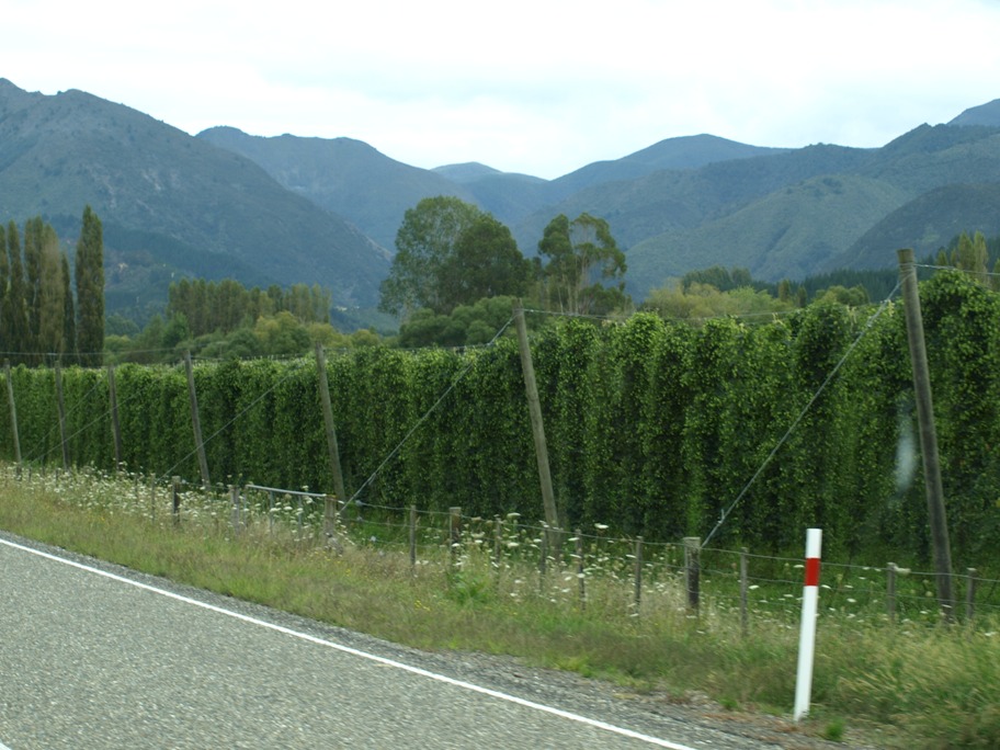 Feb 13th 2011 – We took our leave of Motueka and took the road towards the West Coast. Immediately after leaving the town we were surrounded by fruit trees, mainly apples, some plums and lots and lots of hops! Well they’re very fond of their beer in New Zealandand and have several breweries around the country so they will need lots of hops! Clive’s current favourite is Monteith’s Original, on draught, which may have just eased Speight’s Gold into second place! I have to say that Monteith’s cider is extremely good too! We also think we spotted a few fields of tobacco, at least it looked like tobacco! Unfortunately I didn’t get a photograph of it but I couldn’t miss the hops!