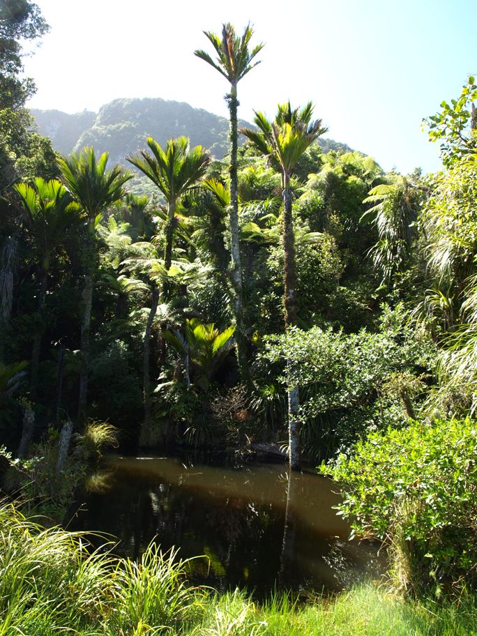 We had decided to make another stop on the way to Greymouth at a place called Punakaiki (pron. poon-a-ky-eeky) where there were some amazing rock formations called The Pancake Rocks. There was a convenient parking area and we managed to just squeeze in, it was quite busy. Also a coach had just arrived and disgorged all its passengers who were now heading across the road to visit the Pancake Rocks so we decided to have coffee and TimTams first before setting off to look ourselves. The car park was next to a lovely little pool surrounded by Nikau Palms (New Zealand’s only native palm), it looked just like an oasis!