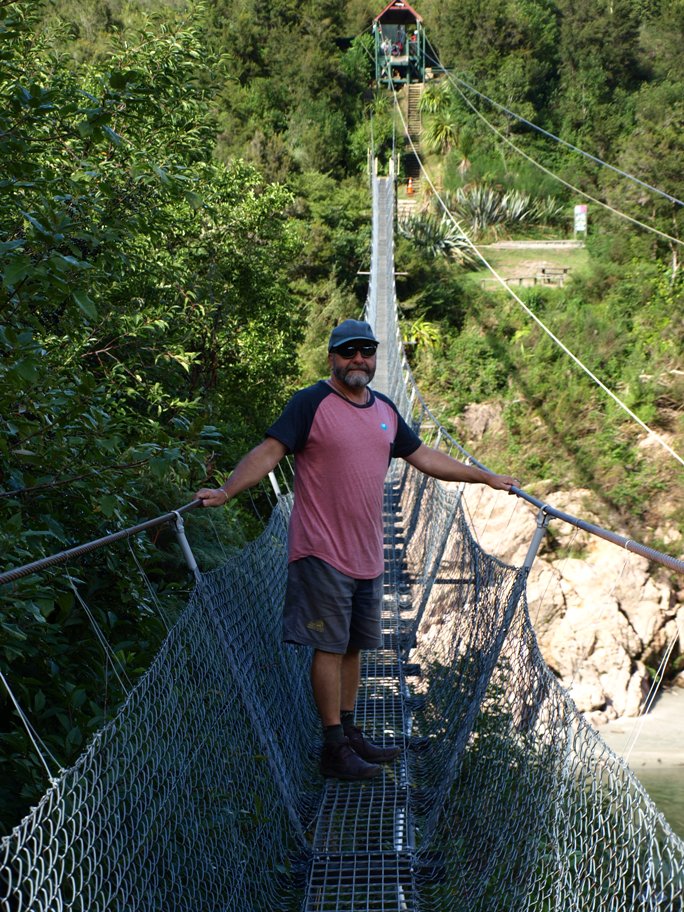 We finally tore ourselves away and headed back over the rocks to the track through the bush and then back over the swing bridge. Alongside the bridge was what the Kiwi's call a Flying Fox, a sort of zipline with a seat! Clive couldn't persuade me to cross over the river using this method so we just had to take a photo of somebody else doing it!!!