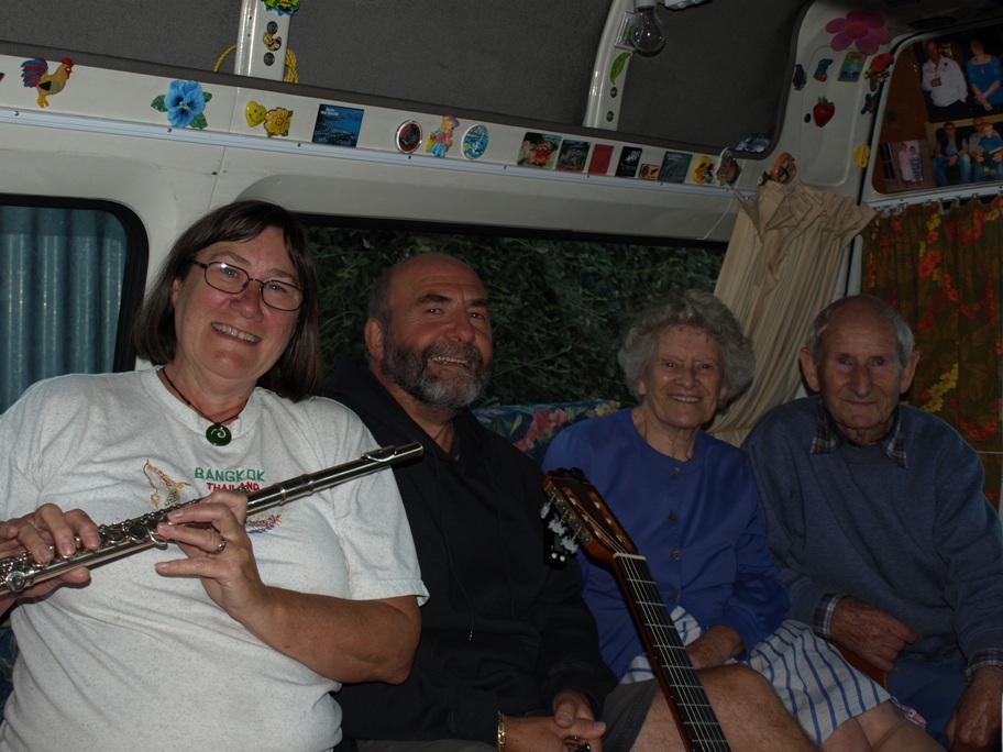 We had our meal and washed up then we set off round to Dorothy and Peter’s van with the guitar and the flute. They really are a delightful couple and we were stunned to learn that Dorothy is 87 and Peter 89! They are still dancing and still touring in their campervan and loving every minute of it. Clive sang Flower of Scotland for them and they were thrilled to bits, he also did Ye Jacobites By Name and we played a few tunes for them as well, they were really delighted. I felt that I had to have a record of this event so I dashed back to our van for the camera and on the way back commandeered a fellow camper from the kitchen to come and take a photo of us all.