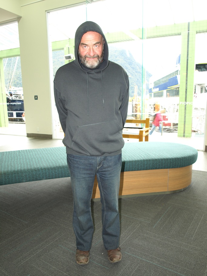 Eventually we arrived at Milford Sound itself. There isn’t a lot there, just a café and bar, visitor centre, loos etc and then the harbour where all the cruise boats dock. There are lots of those! We had commented on the road from Te Anau on how many coaches there were, Clive kept pulling over to let them pass, there were dozens! We checked in at the desk and were told to just hang about until they called us. We watched several other cruise companies loading their passengers on board their vessels, some of which were really big. At this point I just have to post a photo of Clive! Those of you who know him well will laugh at the sight of him in jeans and a hoody looking for all the world as if he deserves an ASBO!