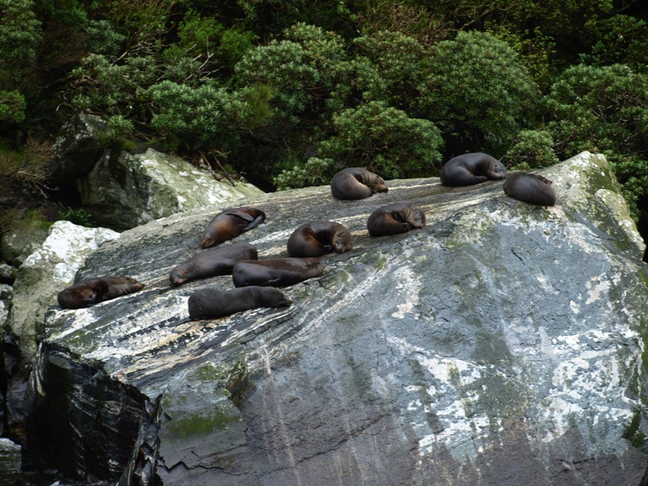 After re-entering the Sound we cruised back up via the Northern shore this time. On the way back the boat slowed right down next to a large, flat rock to enable us to photograph NZ Fur Seals, sleeping without a care in the world and totally oblivious to our presence!
