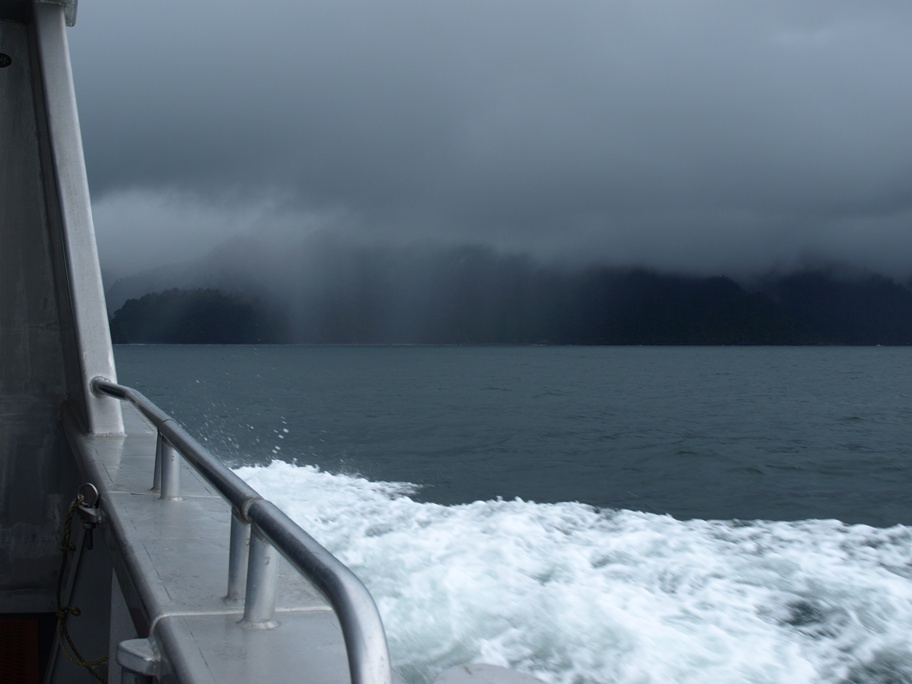 Our cruise was supposed to be a wildlife cruise as well. Unfortunately it’s the wrong season for the Fjordland Crested Penguins, so we knew we wouldn’t be seeing any of those. We did see some Gannets however, right at the very end of the Sound. The boat hugged the Southern shore all the way to the very end of the Sound and out into the Tasman Sea then we turned around and headed back towards the Sound. By now the mist had come down even further and we could also see that it was raining!