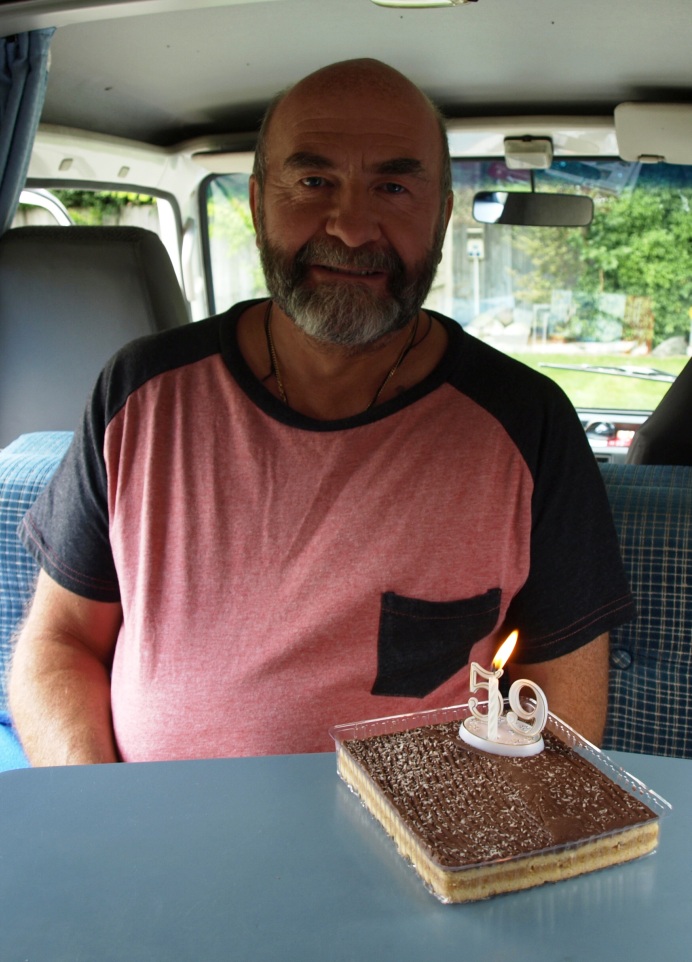 First of all, I had a little surprise up my sleeve for Clive. I had given him a birthday card first thing in the morning when we woke up, which he wasn’t expecting at all! However, unbeknown to him I had managed to buy the nearest thing to a birthday cake at the supermarket in Queenstown where Vicki used to work back in 1999! I had also managed to get a birthday set with numbers and a candle. When he nipped off for a shower before dinner I got it all prepared and when he got back I sang Happy Birthday to him and presented the cake!