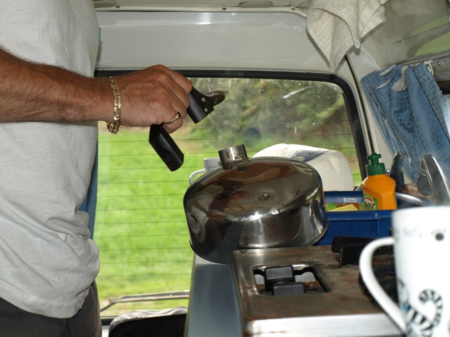 Luckily the kettle itself just landed on the worktop, the handle remained in Clive’s hand! He was so lucky, he could have been badly scalded! He hates that kettle with a vengeance and has been threatening to buy a new one almost since we set off on our travels. The trouble is the only kettles we have seen for sale all over New Zealand are exactly like this one!! Somebody has the monopoly on kettles here obviously! I managed to grab the kettle with the tea towel and finished brewing the coffee. We later found the screw and the washer on the floor and it didn’t take Clive long to fix the handle back on, firmly!
