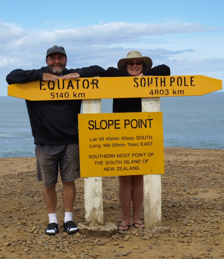 We had to drive back into Invercargill in order to find the road to Dunedin. After a false start and going in completely the wrong direction we finally found the correct road! We hadn’t been going all that long when we noticed a brown sign to Slope Point. Brown Signs in New Zealand, as in the UK, usually mean that there is something of interest at the end of it so we decided to follow it and see where it led us. So glad we did!! I was actually slightly mistaken yesterday when I said Bluff Point was the most Southerly point in New Zealand, it isn’t, Slope Point is! One tends to forget that South Island is actually slightly tilted so the Southernmost point isn't actually right at the bottom! Anyway, it was a lovely view and there was a signpost telling us everything we needed to know. A very kind German gentleman took our photograph with the sign!