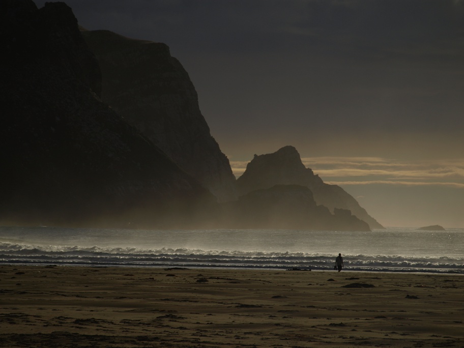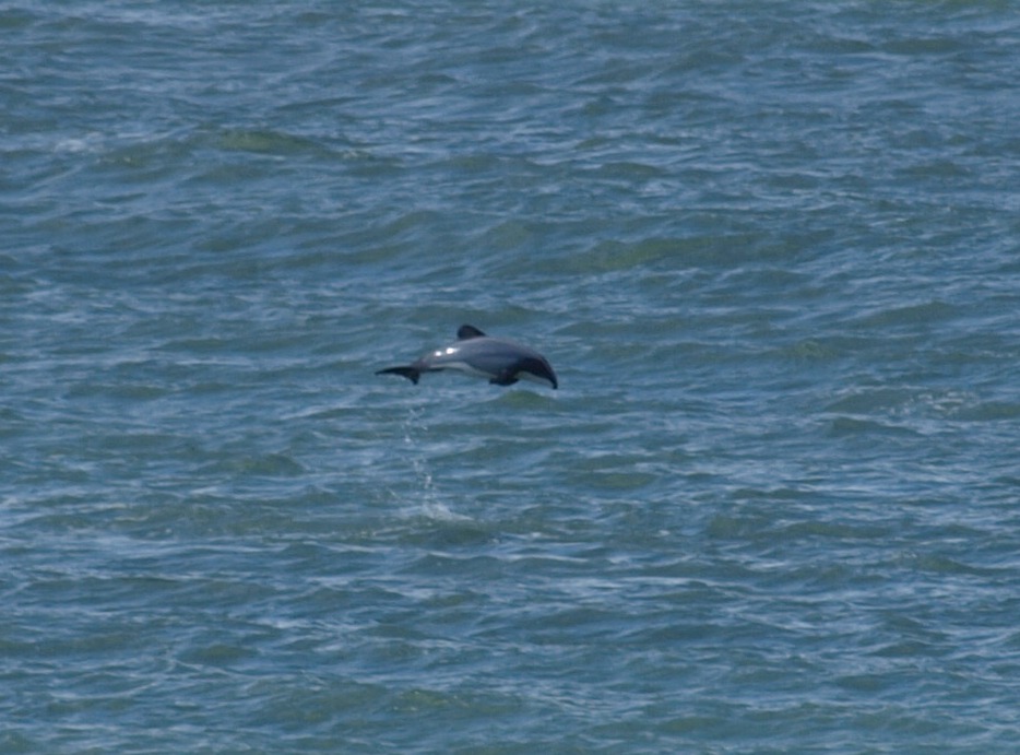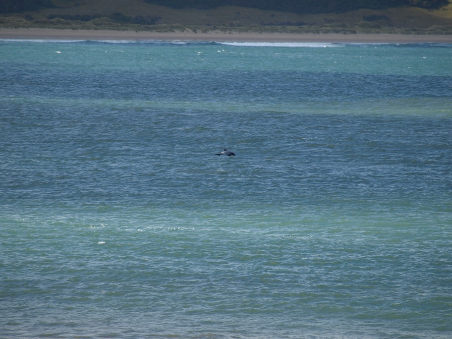 We walked back across the fields to the where the van was parked and set off once more on our journey. We had decided to stay at a DOC site again tonight and this one was really off the beaten track! From Slope Point we took a small side road and soon ended up on gravel. It wasn’t too bad as these gravel roads go but we had to ensure all the windows were shut or else the van just fills up with fine dust which covers every surface! We had seen a spot on the map which we reckoned merited a visit too, Curio Bay it was called! It took quite a while on this little back road and we barely saw another vehicle! Finally we arrived and found that there was a DOC site here too but Clive really fancied the other one. Anyway we went to see what Curio Bay was like and also the next bay to it, Porpoise Bay! Well, Curio Bay itself wasn’t really a bay at all, more like a flat headland but Porpoise Bay was awesome! A really beautiful, perfect bay. It also had another string to its bow, it was the haunt of Hector’s Dolphins! Hector’s Dolphins are not only the smallest of the dolphins but also the rarest. They are only found off New Zealand’s coastline and their numbers have become dangerously low. Clive was really wanting to get off as it was still quite a drive to the other DOC site but he suggested we wait for half an hour to see if any dolphins showed up. About 25 minutes later, during which we had been sitting patiently in the van with all eyes on the bay, Clive suddenly spotted one! I grabbed my camera and ran to the end of the grass overlooking the bay. I set the camera on “Sport” and the next time I saw a splash I pressed the button and took four rapid shots. I had a look and could see that I had got something but presumed it would be pretty blurred from that distance. I carried on watching but didn’t spot any more dolphins so I went back to the van.