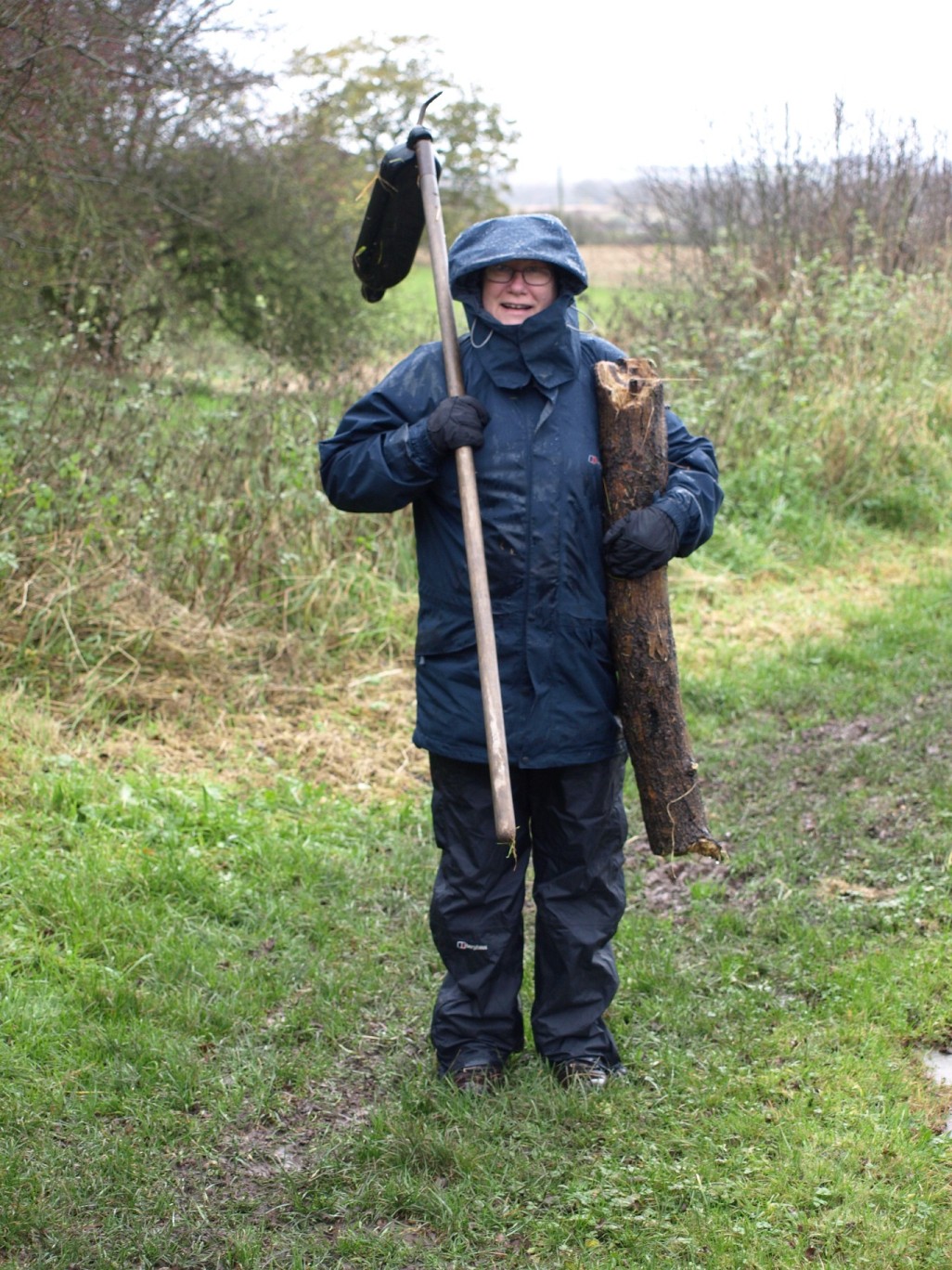 I had to laugh ? a little further on, Mel spotted a fender floating along all by itself and very close by a rather attractive log! Off she jumps and plods back to find them armed with a great bit of kit donated by brother Nick ? a 5ft ash pole with a wicked looking hook on the end that is a real-life antique! Meanwhile, I?m hovering under a bridge, waiting for her return. As she comes back into view it just reminded me of ?The Borrowers? ? you know the little people who go about ?collecting? interesting things? As I said, I had to laugh..